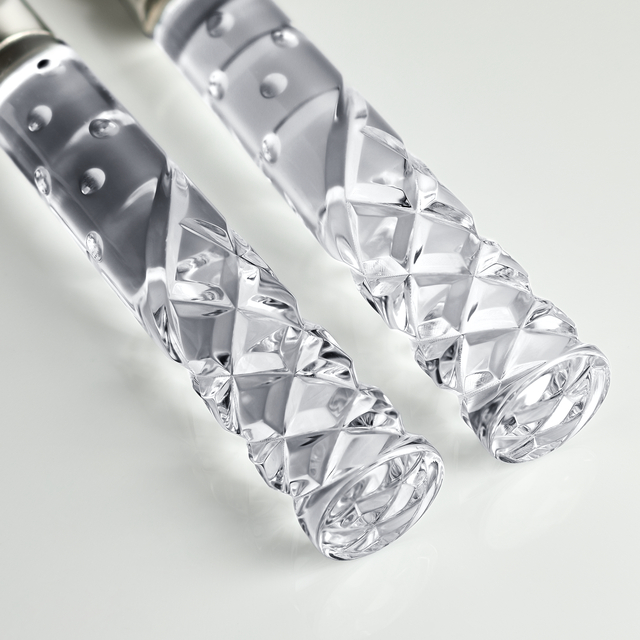 - Deep karo and olive cuts that capture light along crystal handles