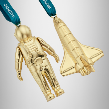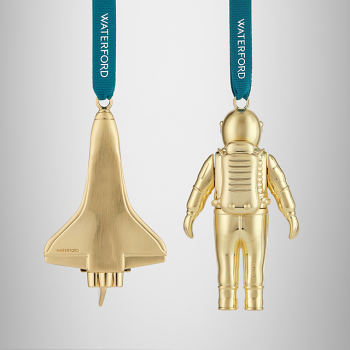 These gold-coloured ornaments are wonderfully crafted in the shape of a spaceman and a rocketship, ready to fly to the moon. Beautifully presented in a signature Waterford box and held within a keepsake cloth bag, this elegant gift will surprise and delight and is certain to be treasured for years to come.