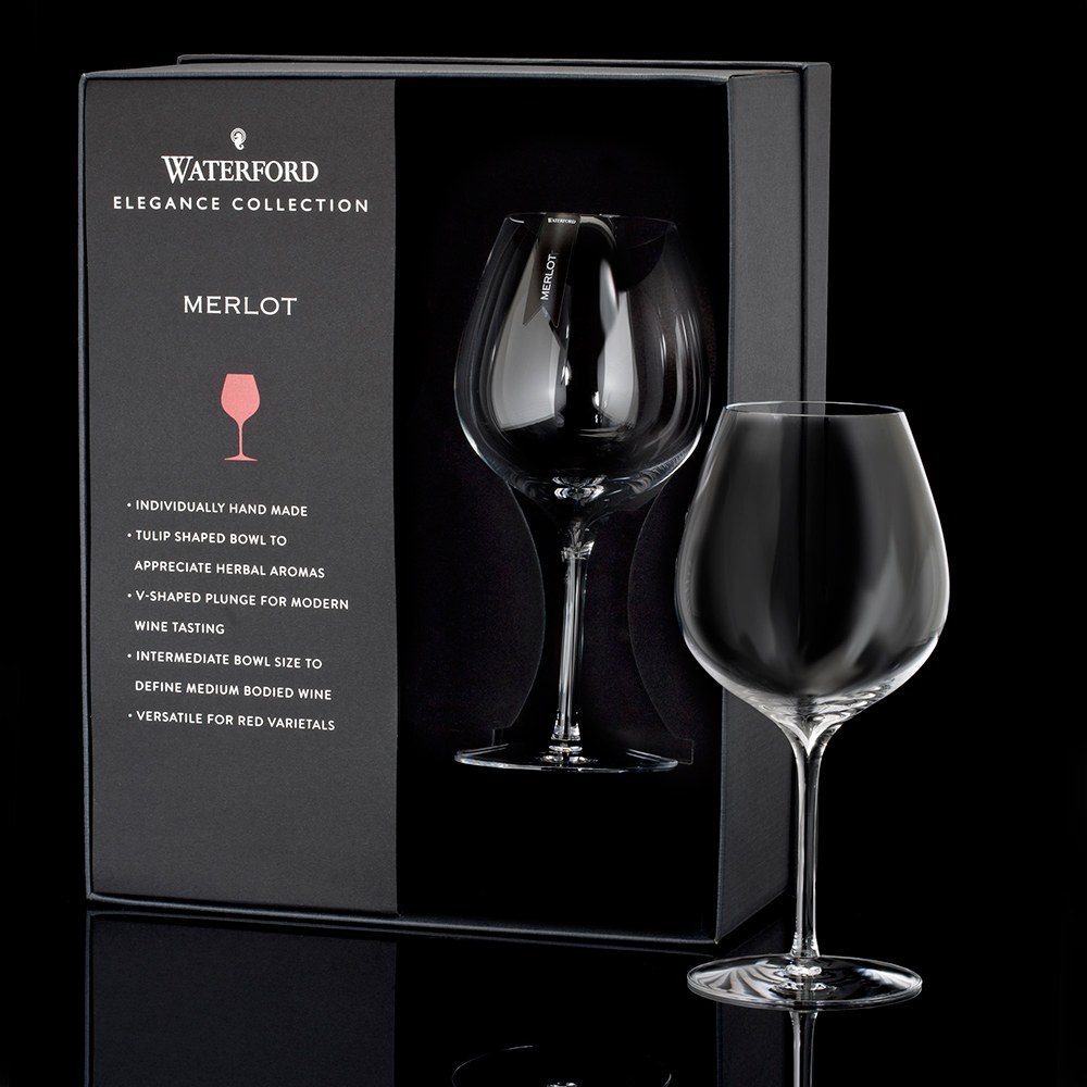 The Waterford Elegance collection is the pinnacle of elite fine wine and spirits enjoyment. This handmade, crystal Merlot Pair is uniquely contemporary in design and deportment, with a clear, delicate bowl, striking deep V plunge, crisp rim, pulled stem and flawlessly modern profile.