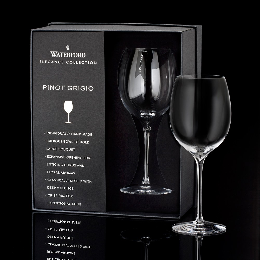 The Waterford Elegance collection is the pinnacle of elite fine wine and spirits enjoyment. This handmade, crystal Pinot Gris/Grigio Pair is uniquely contemporary in design and deportment, with a clear, delicate bowl, striking deep V plunge, crisp rim, pulled stem and flawlessly modern profile.