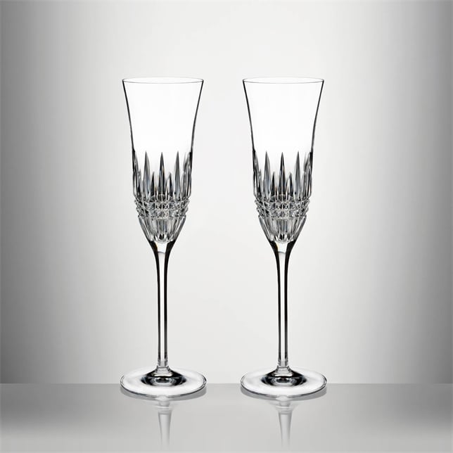 This classic Lismore Diamond Essence Flute Pair offer the perfect serve for your favourite Champagne or sparkling wine. Featuring the intersecting upright and ring cuts of the iconic Lismore Diamond pattern, these stylish crystal flutes glasses produce a striking aesthetic that will co-ordinate with existing Diamond pieces, as well as bring their own style to your home. Hand-crafted from our finest crystal, they offer a reassuring weight in your hand for luxury that you can feel. Beautifully packaged in a signature Waterford grey box, these classic crystal flutes are the perfect gift for Champagne lovers.