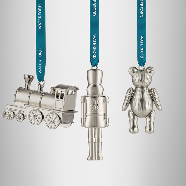 The Steam Train, Teddy, and Nutcracker ornament set captures the heart of holiday nostalgia, crafted with refined details and a pleasing, weighted feel. Each ornament evokes the charm of beloved childhood icons, strung on Waterford's iconic ribbon. Beautifully wrapped in branded tissue paper, a Waterford cloth bag, and a keepsake box, this collection is a treasured addition for those who honor the magic of the season.